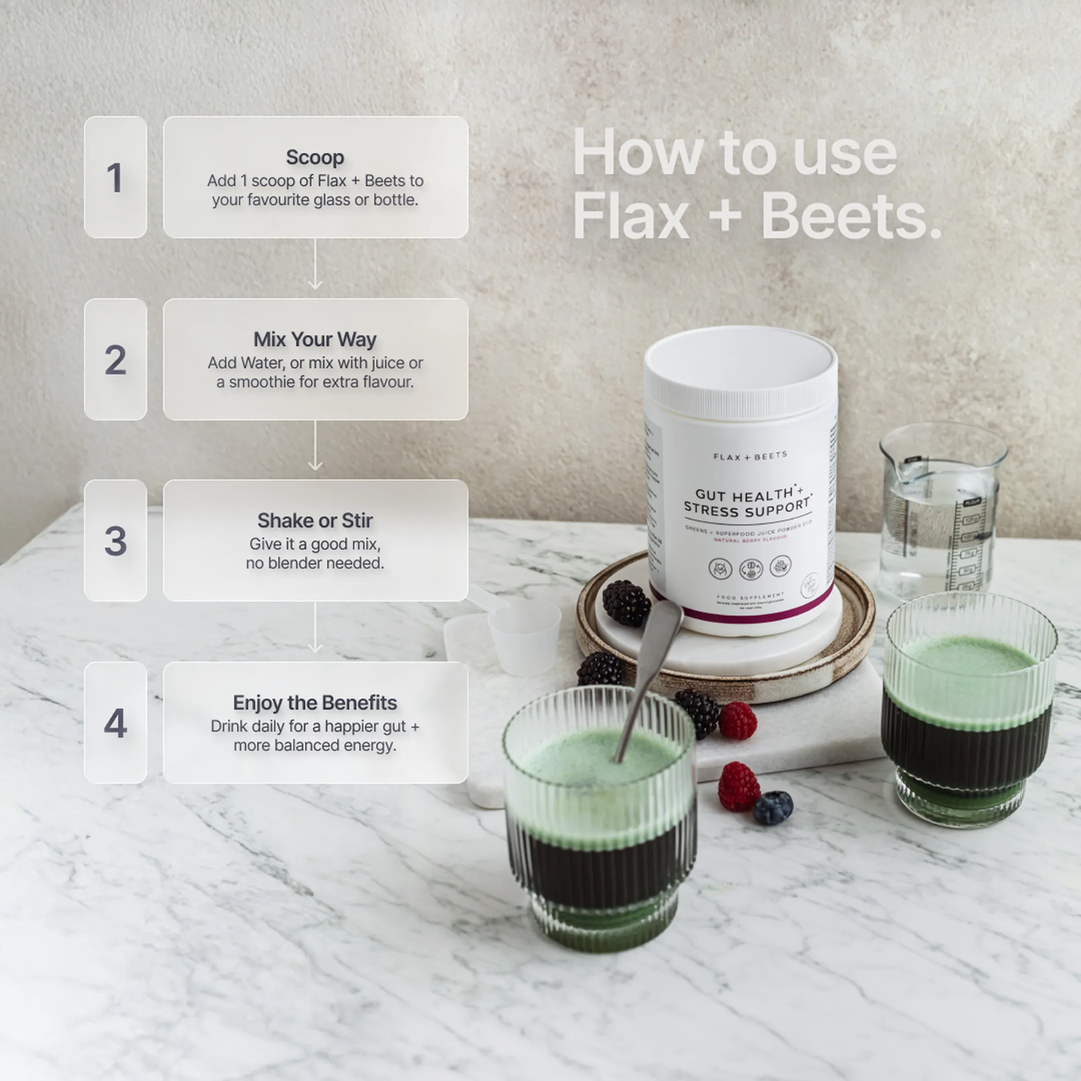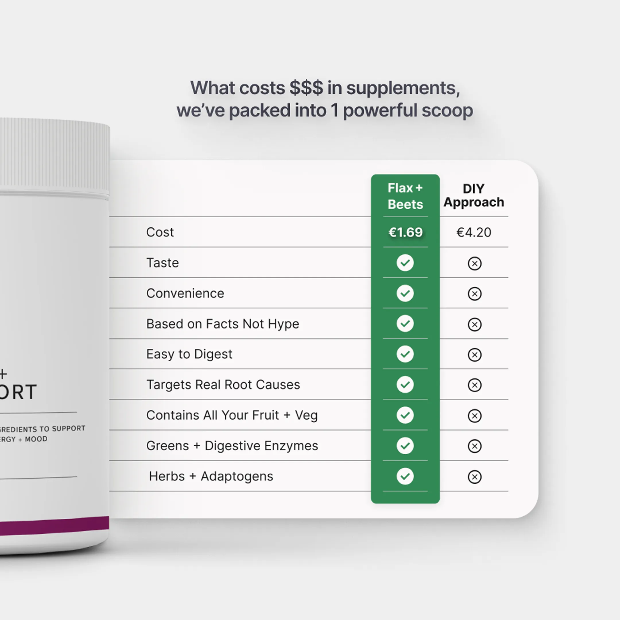 At Flax + Beets we believe that a single supplement can’t fix these issues as it completely misses the bigger picture. If you’re still relying on this, you’re overlooking the real root causes.