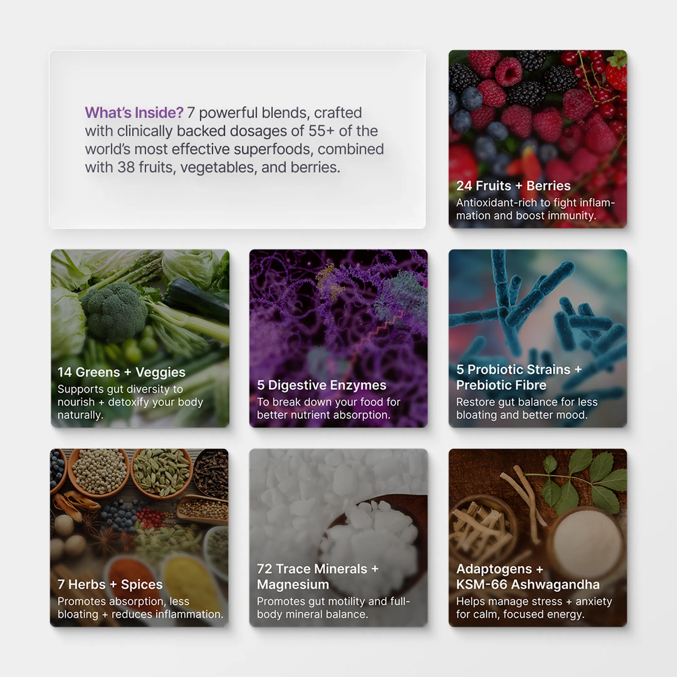 What’s Inside? 7 powerful blends, crafted with clinically backed dosages of 55+ of the world’s most effective superfoods, combined with 38 fruits, vegetables, and berries.